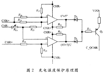 為了確保充電時(shí)的安全性和延長(zhǎng)電池的使用壽命,電池的充電溫度應(yīng)控制在O~45℃之間為宜。該系統(tǒng)采用一個(gè)負(fù)溫度系數(shù)的NTC溫度傳感器RES和一個(gè)2路比較器LM393來(lái)實(shí)現(xiàn)充電溫度保護(hù),其原理圖如圖2所示:當(dāng)充電溫度位于O~45℃之間時(shí),LM393的兩路比較器輸出均為高阻態(tài),PNP型三極管Q1關(guān)斷,對(duì)充電電路不產(chǎn)生影響;隨著溫度的升高,RES阻值逐漸變小,當(dāng)溫度大于45℃時(shí),LM393下面一路比較器反轉(zhuǎn),輸出低電平,通過(guò)二極管D6將Q1的B極拉低,Q1導(dǎo)通,充電MOS管QCHRl的G極C_QCHR被強(qiáng)制拉高,QCHRl關(guān)閉,停止充電;同樣,隨著溫度的降低,RES阻值逐漸變大,當(dāng)溫度小于O℃時(shí),LM393上面一路比較器輸出低電平,通過(guò)二極管D5將Q1導(dǎo)通,從而關(guān)閉QCHRl,停止充電。[page]