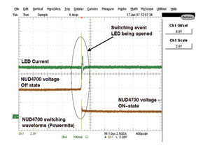 NUD4700的典型工作波形如圖6所示。圖6中,綠色是LED電流波形,棕色是NUD4700關(guān)閉狀態(tài)轉(zhuǎn)換到導(dǎo)通狀態(tài)的波形。橢圓內(nèi)是LED開路瞬間波形,此時(shí),LED電流IF經(jīng)一些波動(dòng)后恢復(fù)到原來電流;與此同時(shí),NUD4700由關(guān)閉狀態(tài)轉(zhuǎn)換到導(dǎo)通狀態(tài),其電壓由VF下降到1~1.2V,其響應(yīng)時(shí)間是很快的(dv/dt最小值為250V/μs)。