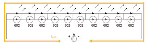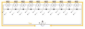 若LED串與驅(qū)動(dòng)器連接時(shí)極性接反,則有可能LED受反壓過大而損壞。由于SMD602內(nèi)部有反接二極管,在LED串極性接反時(shí),其內(nèi)部的二極管極性是正確的,則LED的電流經(jīng)SMD內(nèi)部的二極管形成回路,LED得到保護(hù),如圖10所示。