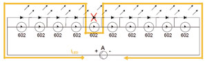 若在串聯(lián)的LED中有一個(gè)開路,如圖9所示,則與此并聯(lián)的SMD602的正、負(fù)極之間電壓大于其開啟電壓4.65~5.25V,此器件由關(guān)閉狀態(tài)轉(zhuǎn)換為導(dǎo)通狀態(tài),降壓為1~1.2V。LED電流經(jīng)SMD602內(nèi)部的晶閘管后流到下一個(gè)LED,保證其他未開路的LED正常工作。圖中用紅線X表示此LED開路。