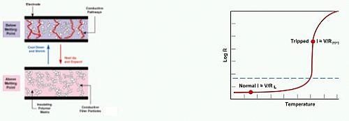 此時電阻可增加到原值的1000倍以上或更高倍數(shù)。電阻增加后,電路中的電流值減至可在故障情況下流動的一個較低且穩(wěn)定的狀態(tài),因而保護了設(shè)備。在元件轉(zhuǎn)變?yōu)楦咦柚禒顟B(tài)下,可稱之為“已動作”。元件將保持已動作(高阻值)狀態(tài),直到故障清除并將設(shè)備的電源斷開,此時,導電性聚合物冷卻下來并重新結(jié)晶,將PPTC元件恢復到較低阻狀態(tài)下,而受影響的設(shè)備也恢復到正常運作狀態(tài)。
