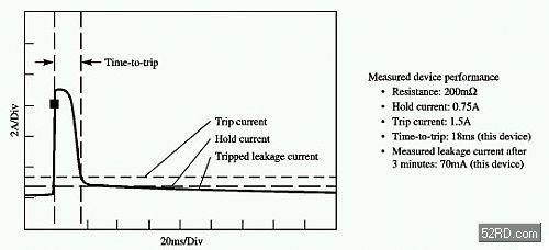 動作時間是PPTC在故障情況下對動作速度的特性所進行之描述。在小功率應用條件下,動作時間是關(guān)鍵因素,因為在整個系統(tǒng)的電壓降低或減弱且系統(tǒng)性能受到影響之前,小型電源維持在短路電流而不受損的時間可能很短。動作時間數(shù)值與元件的設(shè)計、元件的大小和工作電流性能有很大關(guān)系,且還要考慮到電路板設(shè)計;即電路板上較寬的連線或較大的焊接器等同于散熱器,均可增加動作時間??s小焊接器的尺寸,選擇較低的工作電流能夠改善動作時間性能。