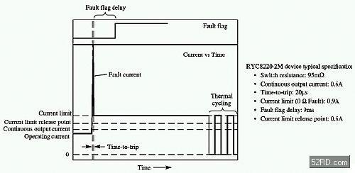 在動作之后,埠處最初的功率耗散是硅元件限制電流的函數(shù)。如果此元件可以在故障狀態(tài)下關(guān)斷,則埠的電流消耗和功率消耗可以忽略不計。如果控制電路無法執(zhí)行這項功能(例如致能Pin在高電位啟動的元件一直接在高電位上,或者電源開關(guān)功能并未內(nèi)置此功能在元件之中時),則絕大多數(shù)硅元件將繼續(xù)對電流進行限制,直至其達到內(nèi)部溫度門檻。在達到這個溫度門檻后,元件將開始對埠進行防止過熱的循環(huán)週期。在這種狀態(tài)下的平均埠消耗電流是熱循環(huán)週期此和電流限制的函數(shù)。對于使用硅元件的小功率應用,重要之處在于配備正確的開/關(guān)電路以防止過高的“動作”狀態(tài)下的消耗功率。