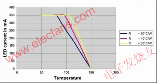 圖1中曲線顯示了1WLED的典型性能下降特性。正如所期望的那樣,這清楚地表明,被恒定電流驅(qū)動的LED在到達某一點后,該恒流需要線性地減少,直到在150℃這一點上達到0。恒流下降點和減小斜率取決于機械/散熱安排。