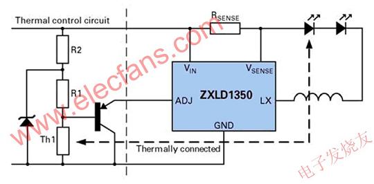 圖3顯示了一個典型的采用簡單熱控制的降壓穩(wěn)壓器例子。它的優(yōu)勢是利用了Zetex半導(dǎo)體公司ZXLD1350的ADJ引腳。通過使用一個PNP晶體管作為發(fā)射極跟隨器和使用該引腳的內(nèi)部250kΩ電阻作為負載來過驅(qū)該引腳,LED電流將與熱敏電阻成比例地下降。隨著溫度下降,熱敏電阻的阻值增加,但由于基準(zhǔn)(base)電壓增加超出了ADJ參考電壓,該晶體管就會關(guān)閉,LED僅獲得其最高設(shè)置電流,從而有效地鉗住低溫響應(yīng)。