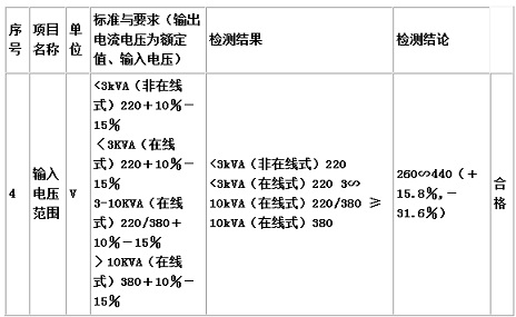 (2)寬輸入電壓范圍。輸入電壓允許范圍為+15%~-30%,在中大功率UPS當(dāng)中還未見到另一品牌UPS經(jīng)過權(quán)威單位檢測達(dá)到此指標(biāo),如附表所示。