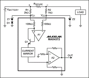 圖1.該檢流放大器帶有保護(hù)電路(上部電路元件),適合于共模電壓高于30V的應(yīng)用。