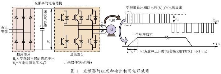 變頻器主要由把交流市電整流成直流的整流器、平滑電壓脈動(dòng)的電容器、6 個(gè)開關(guān)器件構(gòu)成的逆變器所組成。如圖1 所示,逆變器部分輸出由改變脈沖寬度(PWM 波)形成的等效正弦波交流電壓去驅(qū)動(dòng)電機(jī)。近幾年的變頻器為了使電機(jī)低噪音化,逆變部分的開關(guān)器件采用IGBT進(jìn)行著高速開關(guān)動(dòng)作。因此,在PWM 波的每個(gè)脈沖上升和下降時(shí),即開關(guān)時(shí)間以非常短的時(shí)間駐t=0.1~0.3 滋s切換著的時(shí)候,使逆變器內(nèi)部的直流電壓Ed(400 V電力系統(tǒng)用逆變器的Ed=600 V左右)因切換所形成的電壓變化率dv/dt變得很大,這是產(chǎn)生微浪涌的主要根源之一。