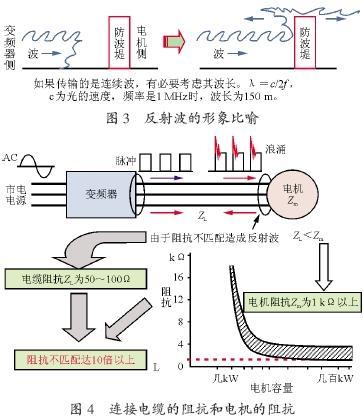 變頻器的輸出脈沖上升或下降時(shí)間很短,是疊加在變頻器輸出給電機(jī)的驅(qū)動(dòng)頻率(基波)及脈沖調(diào)制頻率(調(diào)制波)之外的高頻成分。一般情況下,變頻器與電機(jī)連接電纜的阻抗ZL是50~100 贅,而電機(jī)本身的阻抗ZM,一般數(shù)百kW的電機(jī)也都超過(guò)1 k贅,是電纜阻抗的10 倍以上。這樣,在電機(jī)的接線端子上將發(fā)生阻抗的不匹配現(xiàn)象,造成高頻波成分的反射。在不匹配阻抗連接處的反射系數(shù)M為
