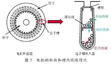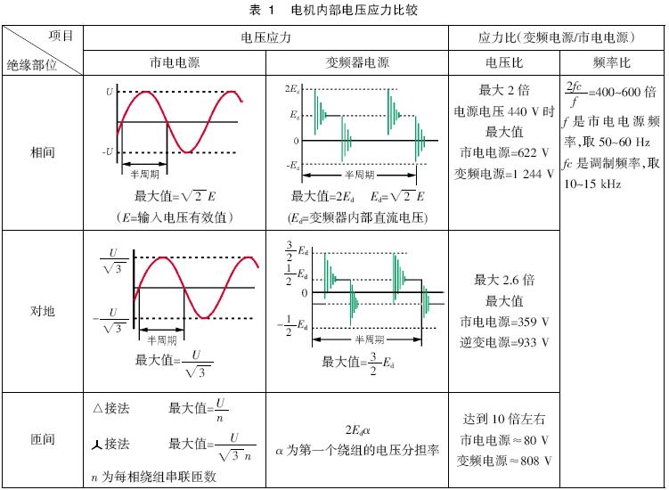 電機(jī)內(nèi)部的斷面如圖7 所示。電機(jī)有定子和轉(zhuǎn)子,定子內(nèi)有安放三相線圈的槽。如果放大槽的內(nèi)部,可以看到有許多的線圈(漆包線),各線圈對(duì)地之間、各相之間、線匝相互之間都有絕緣存在。通常對(duì)地、相間都有絕緣紙插入,而線匝之間沒(méi)有絕緣紙插入,它利用堅(jiān)固的漆包線的漆層獲得絕緣。微浪涌電壓給這些絕緣全部帶來(lái)影響,這些絕緣損壞之中,線圈匝間損壞最多。表1 列出了有關(guān)電機(jī)內(nèi)部各絕緣部分承受的電壓值,也稱為電壓應(yīng)力,提供了用市電電源驅(qū)動(dòng)電機(jī)和用變頻器驅(qū)動(dòng)時(shí)相比較的資料。