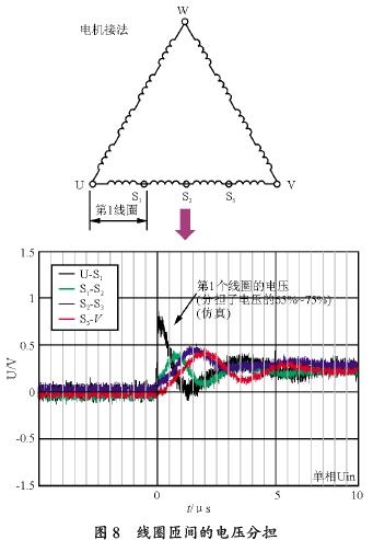 浪涌電壓滲入電機(jī)內(nèi)部的時(shí)候,線圈匝間究竟加上多少電壓,模擬結(jié)果如圖8所示。該模擬是將測(cè)量點(diǎn)放在電機(jī)的每一線圈上(電機(jī)槽內(nèi)的漆包線圈上),在U-V之間加上上升時(shí)間0.14 滋s 的浪涌電壓的測(cè)量的結(jié)果。U-S1之間是第1 線圈分擔(dān)的電壓,測(cè)得它分擔(dān)了全電壓65豫耀75%,而別的線圈S1-S2、S2-S3、S3-V 之間分擔(dān)了10豫耀20%,這是因?yàn)殡姍C(jī)內(nèi)部的阻抗大,微浪涌電壓在逐漸衰減。