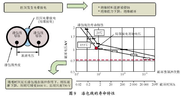在電機(jī)的制造過(guò)程中,漆包線線圈的起頭到末尾完全分離不易做到,多數(shù)情況下是亂繞的,槽里邊線頭和線尾可能緊挨著。如果這樣就會(huì)發(fā)生線匝之間由于微浪涌電壓的電暈放電(局部放電)。那怕放電部分時(shí)間極其短促,局部也會(huì)達(dá)到10 000益,高溫使絕緣逐漸地侵蝕,過(guò)些時(shí)間之后絕緣就會(huì)被破壞。如圖9 所示為直徑0.85 mm、漆皮厚33 滋m、F 級(jí)絕緣、155益漆包線的壽命特性。