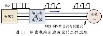 輸出濾波器的工作原理如圖11所示。微浪涌電壓是變頻器輸出脈沖上升時(shí)間出現(xiàn)的dv/dt 過(guò)大所引起,又由于阻抗不匹配被反射而發(fā)生。因此輸出電路使用濾波器,用于抑制dv/dt,也就是抑制了高頻成分因阻抗不匹配而造成的微浪涌。所以輸出濾波器是dv/dt抑制型濾器,這種濾波器在變頻器的調(diào)制頻率為15 kHz、接線長(zhǎng)度為400 m時(shí),能做出微浪涌電壓1 000 V以下的性能非常優(yōu)良的產(chǎn)品。不過(guò),這種方式的濾波器為了讓逆變器的輸出電流通過(guò)電抗器,不得不做成大容量,造成濾波器的大型化、高價(jià)格化、大重量,有的達(dá)到50 kg以上,給用戶造成了實(shí)際負(fù)擔(dān)。