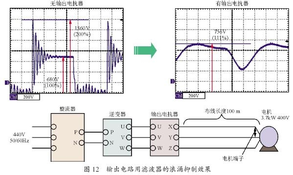 圖12 顯示了供電電源440 V,功率為3.7 kW的變頻器供電給電機(jī)(3.7 kW,400 V),在接線長(zhǎng)度為100 m時(shí)、測(cè)量電機(jī)接線端子U-V 之間的微浪涌電壓的抑制效果。在沒(méi)有輸出濾波器的情況下,微浪涌電壓達(dá)到1 360 V,相當(dāng)于變頻器內(nèi)部直流電壓680V 的200%。有輸出濾波器的時(shí)候,頂峰值電壓是756 V、相當(dāng)于變頻器器內(nèi)部的直流電壓680 V的111%,它和沒(méi)有輸出濾波器的頂峰電壓差距有604 V,抑制效果達(dá)89%。