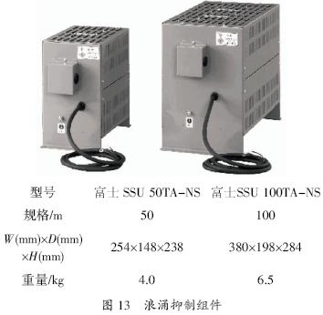 圖13 所示為浪涌抑制組件的外觀。和輸出濾波器相比,浪涌抑制組件是小型化的產(chǎn)品。其技術(shù)指標(biāo)為相間的微浪涌電壓1 000 V以下,防護(hù)等級(jí)為IP20。浪涌抑制組件是對(duì)變頻器的容量不需要選擇,而接線距離需要選擇的產(chǎn)品。另外,接線方法非常簡(jiǎn)單,只需要把浪涌抑制組件的輸入電纜接到電機(jī)接線端子U、V、W上。