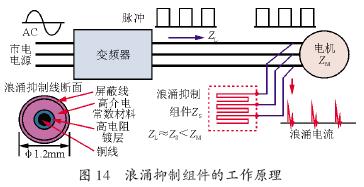 浪涌抑制組件的工作原理如圖14 所示。浪涌抑制組件內(nèi)部卷繞的浪涌抑制線具有和電纜線的阻抗ZL相同的阻抗,因此接到電機(jī)的接線端子上降低了電機(jī)接線端子的阻抗,從而減少了阻抗不匹配時(shí)的反射波。通常高頻波成分在電纜線上的阻抗ZL是50耀100 贅,設(shè)計(jì)的浪涌抑制線的阻抗ZS是50~60歐。