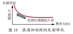 浪涌抑制線的反射降低:浪涌電流的高頻分量在浪涌抑制線內(nèi)被旁路和衰減,使浪涌形狀變鈍,浪涌頻帶中心向低頻方向移動(dòng)。又從浪涌電流來(lái)看,好像浪涌抑制線的特性阻抗逐漸變高了,使得抑制線末端不易被反射回來(lái)。如圖18所示。