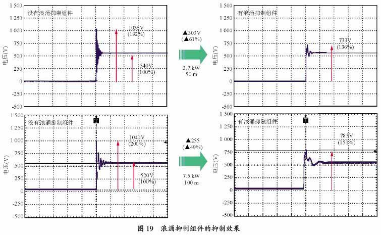 圖19 是變頻器的電源電壓為400 V,3.7 kW的電機(jī)、接線長(zhǎng)度50 m,和75 kW的電機(jī)、接線長(zhǎng)度100 m時(shí)抑制微浪涌電壓的效果。對(duì)于3.7 kW的電機(jī),當(dāng)沒(méi)有浪涌抑制組件時(shí),微浪涌電壓為1 036 V,相當(dāng)于變頻器內(nèi)部的直流電壓540 V的192%;當(dāng)加了浪涌抑制組件時(shí),50 m電纜的峰值電壓為733 V,相當(dāng)于變頻器內(nèi)部的直流電壓540 V的136%。電壓尖峰差距303 V,有61%的抑制效果。對(duì)于75 kW的電機(jī),當(dāng)沒(méi)有浪涌抑制組件時(shí),微浪涌電壓為1 040 V,相當(dāng)于變頻器內(nèi)部直流電壓520 V的200%;當(dāng)加了浪涌抑制組件時(shí),電纜的峰值電壓為785 V,相當(dāng)于變頻器內(nèi)部直流電壓520 V得151%。電壓尖峰差距255 V,有49%的抑制效果。
