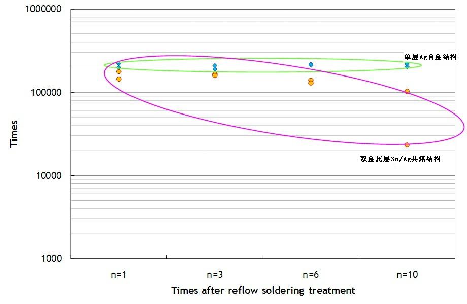 單層Ag合金結(jié)構(gòu)的保險(xiǎn)絲即使經(jīng)過多次高溫?zé)崽幚?,仍可以維持一定的耐脈沖能力,承受脈沖次數(shù)都可達(dá)十萬次以上。但是雙層Sn/Ag共熔結(jié)構(gòu)的保險(xiǎn)絲,其承受脈沖能力有明顯下降的趨勢,在經(jīng)過10次回流焊錫爐熱處理后,承受脈沖次數(shù)就會下降到十萬次以下。