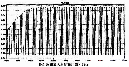 C5是防止低頻噪聲干擾的對策,加了C5后,反相放大器的放大倍數(shù)R9/R7中,R9仍為(220k Ω),R7則變成由C5(0.22 μF)和4.7kΩ合成的。電容的容抗為1/(j*w*C),對于低頻信號容抗很大,對于高頻信號接近短路,這樣對于低頻信號放大倍數(shù)較大幅度減小,而對于高頻信號放大倍數(shù)幾乎不變,起到了抑制低頻干擾信號的作用,防止了誤觸發(fā)。圖5是該電路對80mV信號放大后在PSPICE中仿真的輸出: