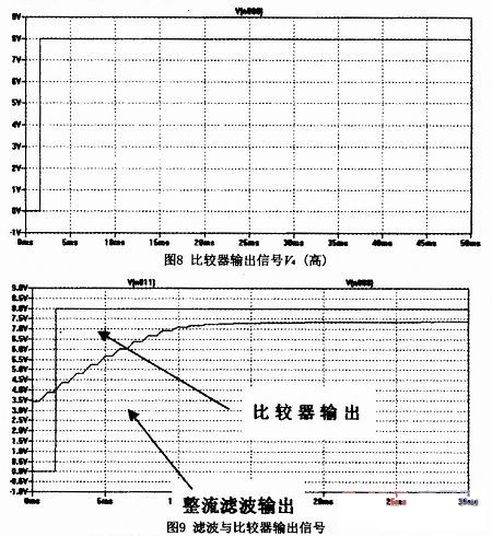 整流濾波后的信號V2,輸入到比較器IC4的正信號端,與IC4的負(fù)端電壓(V3=Vcc/2=4V))進(jìn)行比較。當(dāng)信號電平值大于4V時,比較器輸出高電平(V4接近運放的電源8V),當(dāng)信號電平值小于4V時,比較器輸出低電平(V4接近0V),該兩個電平將控制后級檢測電路。圖8為AUX輸入信號后經(jīng)比較器輸出高電平的仿真輸出,圖9為濾波和比較器的仿真輸出信號。