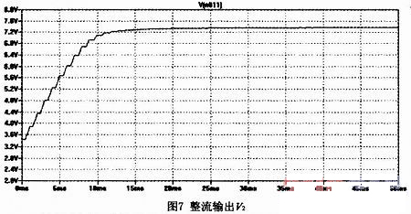 整流電路由D1、R10、C6組成(參見圖6)。它起到了平緩放大后信號的變化幅度,使它接近直流信號的作用。當(dāng)V1和V2之間的壓差大于二極管的導(dǎo)通電壓時,二極管導(dǎo)通,對電容C6充電(同時一部分電流流過R10及比較器的輸入阻抗);當(dāng)V1和V2的壓差小于二極管的導(dǎo)通電壓時,二極管截止,電容上的電荷通過R10(及比較器的輸入阻抗)放電。當(dāng)放電到V1和V2的壓差再次大于二極管的導(dǎo)通電壓時,二極管導(dǎo)通,又開始充電的過程。該電路就反復(fù)地進(jìn)行這樣的充放電過程。由于R10、C6值都很大,放電的速度很慢,電容電壓接近直流。由微分方程可得,放電時間T=RC1n(Vo/Vt),Vo為放電初始電壓,Vt為放電后的電壓,R為放電通路的電阻值,C為放電的電容值??梢奟,C越大,放電時間越長,即電壓越不容易變化。圖7為整流濾波的仿真輸出。