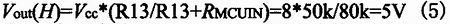 當(dāng)比較器輸出低電平,Q1截止,8V通過R13與微控芯片(MCU)相應(yīng)端口的輸入阻抗RMCUIN進(jìn)行分壓,通常MCU相應(yīng)端口的輸入阻抗RMCUIN≈ 50kΩ,則輸出高電平可以由如下計算得到: