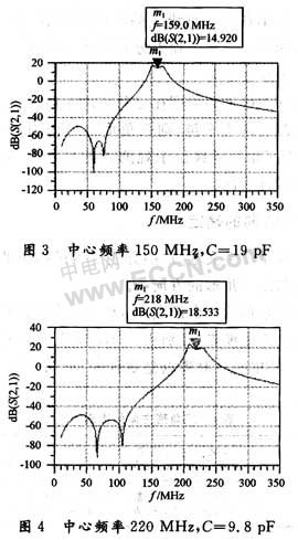 通常,電調(diào)諧濾波采用雙極點(diǎn)調(diào)諧濾波,諧振回路分為串聯(lián)諧振回路和并聯(lián)諧振回路,通過電感或電容進(jìn)行耦合。此電調(diào)濾波器采用的是并聯(lián)諧振回路,用電感進(jìn)行耦合。在進(jìn)行仿真之前,需要建立仿真模型和設(shè)計各種參數(shù)?;谝陨夏P?,利用ADS軟件對電調(diào)濾波器進(jìn)行電路設(shè)計和仿真。由于系統(tǒng)要求對該電調(diào)濾波器進(jìn)行AGC控制,所以在仿真時加入雙柵FET。傳輸函數(shù)S21、頻率范圍設(shè)在10~350 MHz、電容在2.6~39 pF之間變化,仿真使用的放大器是NE25118。最終的ADS模型仿真結(jié)果如下面兩組曲線所示。若LC濾波器不使用放大器,仿真結(jié)果中可以看出濾波器的插損在2~3 dB左右。