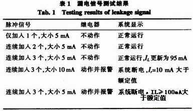 為了測試需要,我們設(shè)計了一個信號源,可以按照系統(tǒng)檢測信號的要求產(chǎn)生脈沖信號,以脈沖信號來模擬漏電信號。設(shè)定緩變電流動作值為100 mA,突變電流動作值為8 mA,當(dāng)緩變電流累計值達到90 mA時,測試結(jié)果如表1所示。