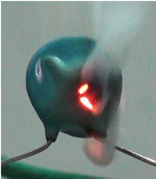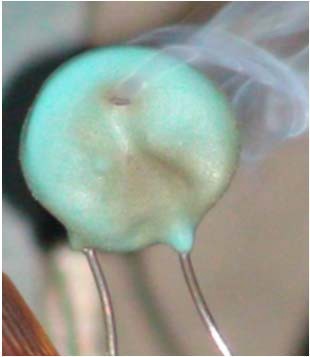 圖5:MOV14D471 在600V*5A 電流試驗(yàn)后圖片 圖6:MOV14D471 在600V*10A 電流試驗(yàn)后圖片