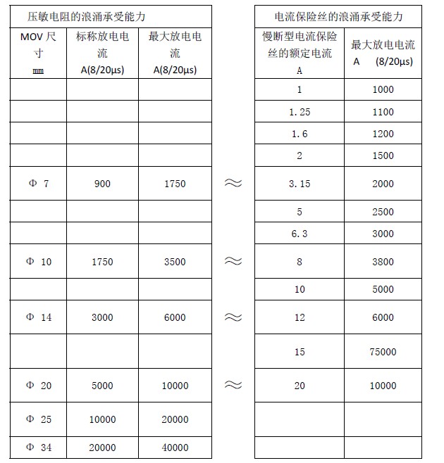 3.1 壓敏電阻MOV 與電流保險(xiǎn)絲FUSE 的浪涌電流承受能力對(duì)比,見表1