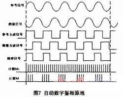 由于測量信號頻率較高,直接對其進行鑒相難以達到良好的鑒相精度,因而在系統(tǒng)中采用混頻的方法進行差頻鑒相。在差頻鑒相中,參考信號和測量信號同時與本振信號進行混頻,濾除混頻后高頻分量,得到混頻后低頻參考信號和混頻后低頻測量信號。混頻降低了信號頻率,但保持相位差不變,便于鑒相操作。相位差的檢測使用自動數(shù)字鑒相法。其原理如圖7所示。參考信號和測量信號通過過零比較,得到參考方波信號和測量方波信號。比較兩方波信號,得到兩者之間的相位差信號,然后使用高頻計數(shù)脈沖對相位差信號,然后使用高頻計數(shù)脈沖對相位差信號進行計數(shù)。設參考信號和測量信號的周期為f,高頻計數(shù)脈沖的頻率為fc,一個周期內(nèi)的計數(shù)值為M,則相位差為:△φ=2πMf /fc。為了減小偶然誤差,提高鑒相精度,可以對多個周期計數(shù)求平均。設N個周期的計數(shù)值為M'',則△φ=2πM''f/Nfc。