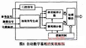 混頻電路的實現(xiàn)基于混頻器AD831。使用兩片AD831,分別用于參考信號與本振信號混頻及測量信號與本振信號混頻?;祛l后使用芯片MAX274進行帶通濾波,得到混頻后的低頻正弦信號。然后通過基于MAX912的過零比較電路將正弦信號轉(zhuǎn)換為同相位差的方波信號,輸入到FPGA中進行鑒相。在FPGA中,利用多周期自動數(shù)字鑒相法,對相位差進行檢測。其實現(xiàn)框圖如圖8所示。