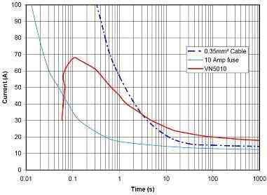在圖3的示例中有一個(gè)點(diǎn),智能開(kāi)關(guān) (VN5010)將繼續(xù)前行,而電線將開(kāi)始自毀(紅線在藍(lán)色虛線上方)。如果這種情況是真實(shí)的,甚至連電路板都可能會(huì)自毀?,F(xiàn)在考慮到涌流要求很可能更加嚴(yán)格,我們開(kāi)始意識(shí)到有必要開(kāi)發(fā)一個(gè)能夠仿真熔斷器特性的保護(hù)算法。