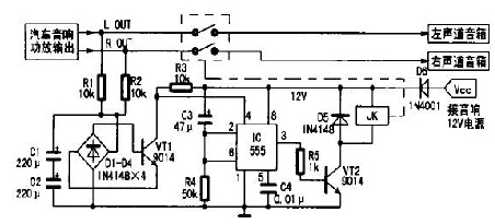 555一定要選用功耗很低的CMOS時基電路。VT1、VT2用9014、C1815型小功率塑封晶體管,要求電流放大倍數(shù)β>100.D1~D5均用1N4148型硅開關(guān)二極管,D6用于電源接反保護(hù),可選用1N4001~1N4007型硅整流二極管。R1~R5均用0.5 W五色環(huán)金屬膜電阻。C1、C2用優(yōu)質(zhì)鋁電解電容,C3要選用漏電小、精度高的鉭電解電容,否則將影響延時精度。JK選用12 V/7 A雙聯(lián)型繼電器(左、右聲道各用一組),如JZC-22F.