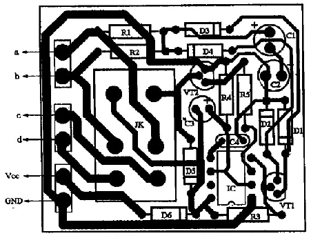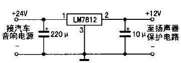 具體制作如下:先把功放輸出端與音箱的引線切斷,按圖2所示電路將引線頭a、b分別接功放的兩組輸出端,c、d分別接左、右聲道音箱:揚(yáng)聲器保護(hù)電路的電源只能從收放機(jī)中獲取,不可直接從汽車12 v電源中獲取,否則不起開/關(guān)機(jī)保護(hù)作用;若是柴油車所配置的收放機(jī)(使用24 V電源),則要求增加一個降壓電路(見圖3所示),給揚(yáng)聲器保護(hù)電路供電,以免電源電壓過高損壞IC。