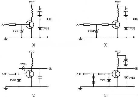 各種瞬變電壓能使晶體管的EB結(jié)或CE結(jié)擊穿而損壞,特別是晶體管集電極有感性(線圈、變壓器、電動機)負載時,通常會產(chǎn)生高壓反電勢,因而可能使晶體管損壞。在實際應(yīng)用中,建議采用TVS作為保護器件。圖3所示為TVS保護晶體管的四種電路實例。