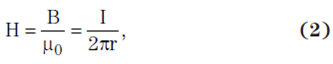 其中,B 為以第平方米伏秒 (V•s/m2) 表示的磁通密度,μ0 為自由空間中的磁導(dǎo)率(計(jì)算方法為 4π × 10–7 V•s/A•m),I 為以安培為單位的電流,r 為以米為單位的導(dǎo)體距離,而 H 為以安培每米 (A/m) 為單位的磁場(chǎng)強(qiáng)度。