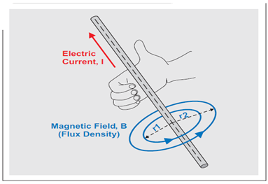 諸如電動(dòng)機(jī)的電源線等帶電導(dǎo)體,其周圍便是一個(gè)由流經(jīng)它的電流形成的磁場(chǎng)。應(yīng)用右手定則(請(qǐng)參見圖 1),我們很容易便可以確定該磁場(chǎng)的方向。該定則的內(nèi)容如下:用右手握住導(dǎo)體,然后拇指指向電流的方向,這時(shí)環(huán)繞導(dǎo)體的手指便指向磁場(chǎng)的方向。因此,磁通線的平面始終與電流垂直。