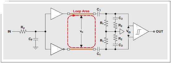 電容隔離器由兩塊硅芯片—一個(gè)發(fā)送器和一個(gè)接收機(jī)組成(請(qǐng)參見圖 2)。數(shù)據(jù)傳輸在由兩個(gè)電容構(gòu)成的差動(dòng)隔離層之間進(jìn)行,在每個(gè)電容的二氧化硅 (SiO2) 電介質(zhì)兩端都有一塊銅頂片和一個(gè)導(dǎo)電硅底片。發(fā)送器芯片的驅(qū)動(dòng)器輸出通過一些接合線連接到接收機(jī)芯片上隔離電容的頂片。通過將電容的底片連接接收機(jī)輸入構(gòu)成了一個(gè)導(dǎo)電環(huán)路。圖 3 顯示了隔離層的等效電路結(jié)構(gòu)圖,并標(biāo)示出了金接合線之間的環(huán)路區(qū)域。很明顯,穿過該環(huán)路的磁場(chǎng)將會(huì)產(chǎn)生一個(gè) EMF,其表示下面 RC 網(wǎng)絡(luò)的輸入電壓噪聲 Vn1。我們常常碰到的第二種差動(dòng)噪聲部分 Vn2,其產(chǎn)生原因是共模噪聲到差動(dòng)噪聲的轉(zhuǎn)換。兩個(gè)噪聲分量共同組成了綜合噪聲 Vn。如果只考慮 EMF 的影響,則可以保守地將 Vn 一分為二: