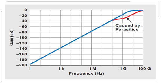 一次電路仿真證實(shí)了 RC 網(wǎng)絡(luò)為一個(gè)一階高通濾波器,其 C′1 和 R′1 為主要組件,頻率高達(dá) 100 MHz(參見圖 5 中藍(lán)色曲線)。超出這一頻率以后,寄生組件 C′2 和R′2生效,從而引起稍稍偏離于線性的斜率。因此,頻率達(dá)到 100 MHz 以后,增益響應(yīng)可以表示為 VID/vn 的比: