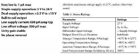圖2:AD8625/AD8626/AD8627運(yùn)算放大器的"主要特性"和絕對(duì)最大值規(guī)格