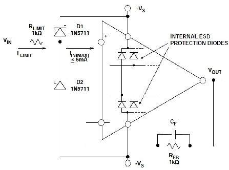 ESD電壓通常高達(dá)數(shù)千伏。大多數(shù)人都有被靜電電擊的體驗(yàn)。在尼龍地毯上拖著腳走,特別是在干燥環(huán)境下,并觸摸金屬門(mén)把手,就有可能被電到,火花從指尖飛出。CMOS電路特別容易因ESD損壞,雙極性電路同樣可能受損。多數(shù)運(yùn)算放大器的輸入引腳內(nèi)置ESD保護(hù)二極管,以便能夠在PC板裝配階段處理IC.為使電容和泄漏最小,這些二極管一般很小,不是用來(lái)應(yīng)付數(shù)mA以上的持續(xù)輸入電流。