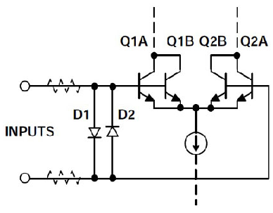 圖4:具有D1-D2輸入差分過(guò)壓保護(hù)網(wǎng)絡(luò)的運(yùn)算放大器輸入級(jí)