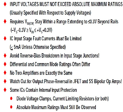 運(yùn)算放大器和儀表放大器的這些不同過(guò)壓防范措施看起來(lái)很復(fù)雜,事實(shí)上也的確如此!只要運(yùn)算放大器(或儀表放大器)輸入(和輸出)超出設(shè)備邊界條件,就可能發(fā)生危險(xiǎn)情況或器件損毀。顯然,為了實(shí)現(xiàn)最高可靠性,必須防患于未然?! ?br />