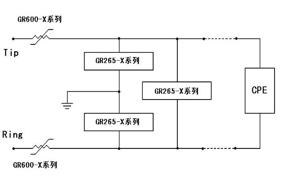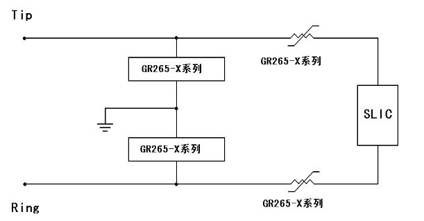 目前本公生產的GR265-X和GR600-X 等系列高分子PTC 熱敏電阻和半導體固體放電管一起用于總配線架的保安單元中,可以滿足過流和過壓保護的要求,同時幫助保安單元滿足中國通信行業(yè)標準 YD/T 694-1999-2002、北美 TelcordiaGR-974 及 ITU-T K.20 等標準,典型的使用電路如上圖所示。
