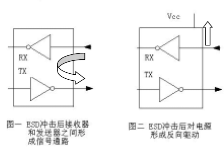 某些RS-232 接口電路中的ESD 保護(hù)結(jié)構(gòu)經(jīng)過ESD 沖擊后可能在輸入端與供電電源Vcc之間形成電流通路圖二對其供電電源產(chǎn)生反向驅(qū)動(dòng)如果供電電源沒有吸入電流的能力通常來講電源輸出回路里有一個(gè)正向二極管這將導(dǎo)致電源電壓Vcc 的增加從而損