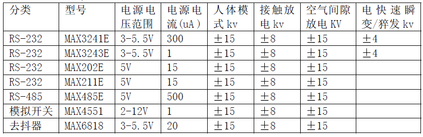 收的COM 端口需要8 個(gè)TransZorb?二極管費(fèi)用高達(dá)$2一種有效的方法是采用內(nèi)部集成ESD 防護(hù)功能的串行接口器件這種器件比普通無防護(hù)功能的器件價(jià)格要貴但增加的費(fèi)用比起外加防護(hù)二極管的費(fèi)用要低內(nèi)部集成的ESD,防護(hù)電路不會(huì)增加任何輸入輸出管腳的等效電容也節(jié)省了電路板面積MAXIM公司近幾年發(fā)展了享有專利的集成ESD防護(hù)技術(shù)并可提供全系列的ESD防護(hù)串行接口器件包括與標(biāo)準(zhǔn)器件完全兼容的產(chǎn)品MAXIM公司還將同樣的技術(shù)應(yīng)用到模擬開關(guān)和開關(guān)去抖產(chǎn)品中所有這些器件的ESD 防護(hù)能力都符合15kV IEC1000-4-2 氣隙放電8kVIEC1000-4-2 接觸放電15kV人體模型HBM 測試標(biāo)準(zhǔn)下表是MAXIM公司具有抗靜電功能的器件。