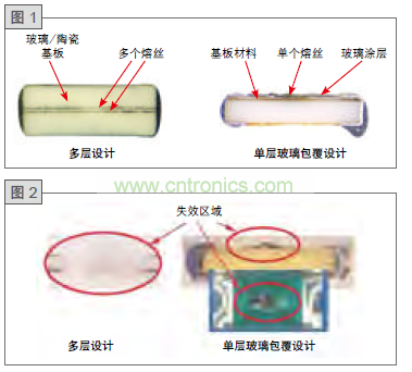 圖1比較了SFF保險(xiǎn)絲的多層設(shè)計(jì)與標(biāo)準(zhǔn)玻璃包覆設(shè)計(jì)。當(dāng)熔絲斷開(kāi)時(shí),玻璃包覆設(shè)計(jì)僅依靠熔絲一側(cè)上的涂層吸收汽化熔絲材