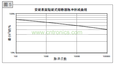一旦確定了應(yīng)用波形的I2t值,它必須根據(jù)系統(tǒng)壽命中的預(yù)期循環(huán)次數(shù)折減。由于電流脈沖導(dǎo)致的應(yīng)力本質(zhì)上是機(jī)械作用力,受力次數(shù)對(duì)保險(xiǎn)絲折減程度具有重要影響。圖5給出了TE Connectivity表面貼裝式保險(xiǎn)絲在十萬(wàn)次循環(huán)內(nèi)的電流脈沖折減曲線。